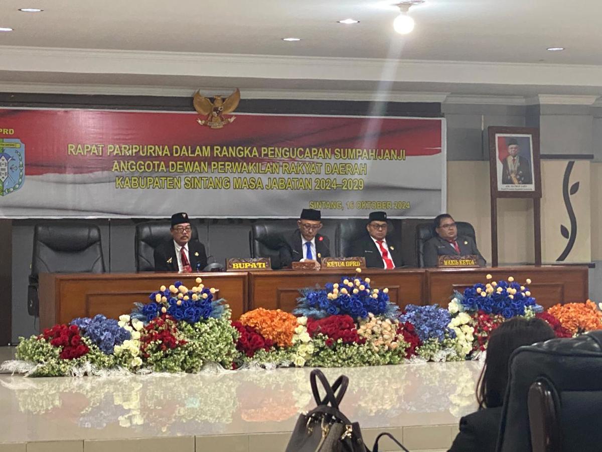 SINTANG—Dewan Perwakilan Rakyat Daerah (DPRD) Kabupaten Sintang, Kalimantan Barat menggelar rapat paripurna pengucapan sumpan dan janji jabatan Anggota DPRD Sintang masa jabatan 2024-2029, Rabu 16 Oktober 2024.
