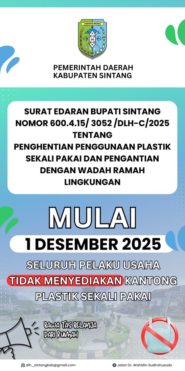 SINTANG – Bupati Sintang, Gregorius Herkulanus Bala, resmi menerbitkan Surat Edaran Nomor 600.4.15.1/30153/DLH-C/2025 mengenai penghentian penggunaan plastik sekali pakai dan peralihan ke wadah ramah lingkungan.