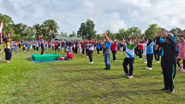 Acara dimulai dengan sesi senam yang dipandu oleh instruktur profesional. Para guru mengikuti setiap gerakan dengan lincah dan penuh energi. Suasana lapangan dipenuhi senyum, sapaan akrab, dan canda tawa yang menambah hangatnya kegiatan, sekaligus menegaskan kuatnya solidaritas komunitas pendidikan di Sintang.