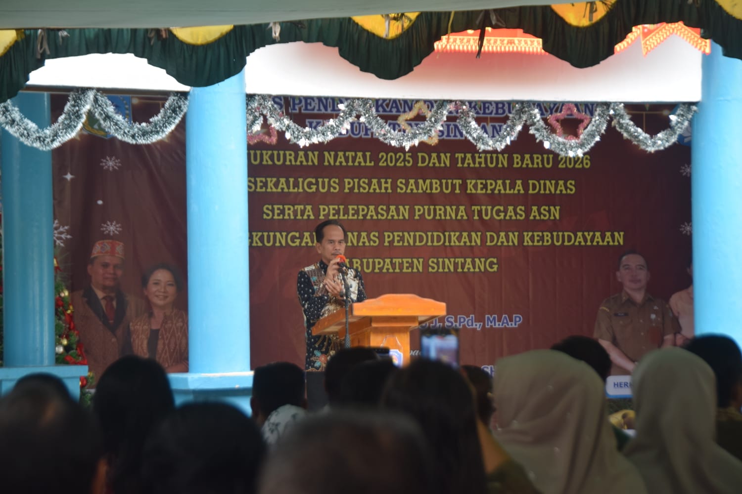 Acara ini dirangkaikan dengan perayaan Natal Tahun 2025 dan Tahun Baru 2026, serta momen perpisahan bagi sejumlah aparatur sipil negara (ASN) di lingkungan Dinas Pendidikan dan Kebudayaan Kabupaten Sintang yang telah memasuki masa purna tugas.