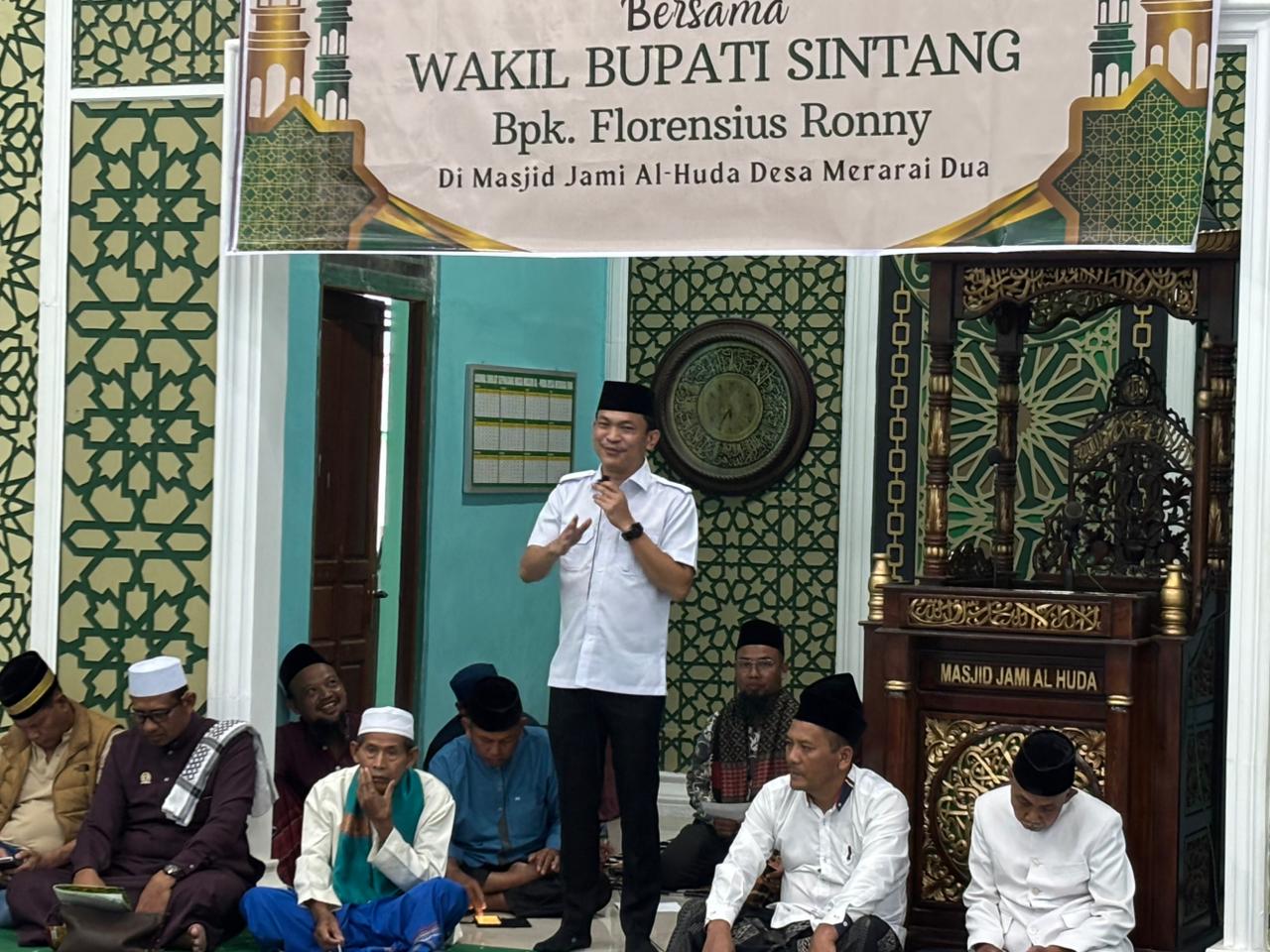 SINTANG, DN – Florensius Ronny melaksanakan kegiatan Safari Ramadhan ke Masjid Jami’ Al-Huda Desa Merarai Dua, Kecamatan Sungai Tebelian, pada Rabu, 25 Februari 2026. Kegiatan tersebut menjadi bagian dari agenda rutin Pemerintah Kabupaten Sintang dalam mempererat silaturahmi dengan masyarakat sekaligus memperkuat nilai kebersamaan di bulan suci Ramadhan.